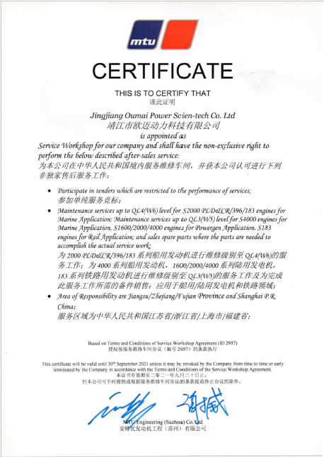公司于2016年6月通过了安特优发动机(苏州)有限公司(MTU苏州)关于MTU船用重要维修资质的认证。